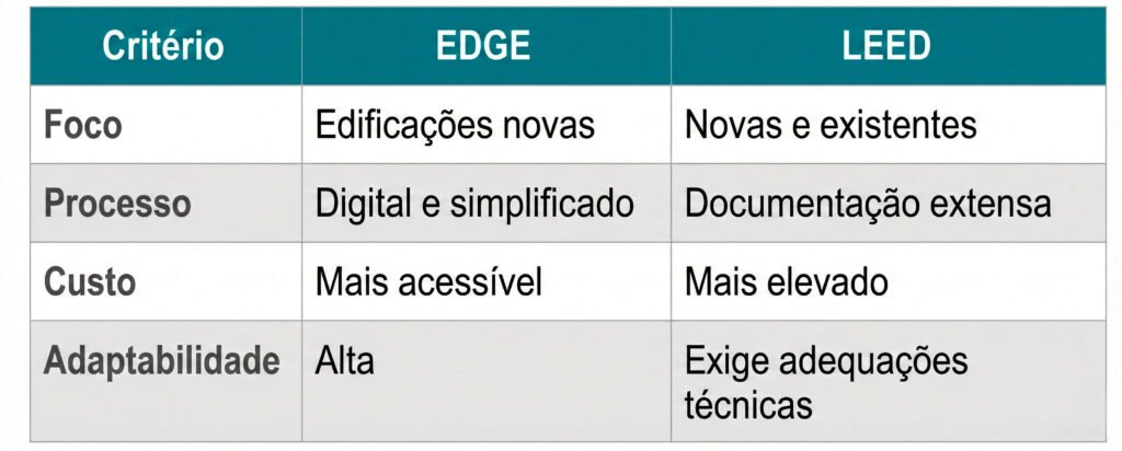 - LEED v5: indicada para projetos complexos, com metas ambiciosas de carbono, conforto e padrão internacional.